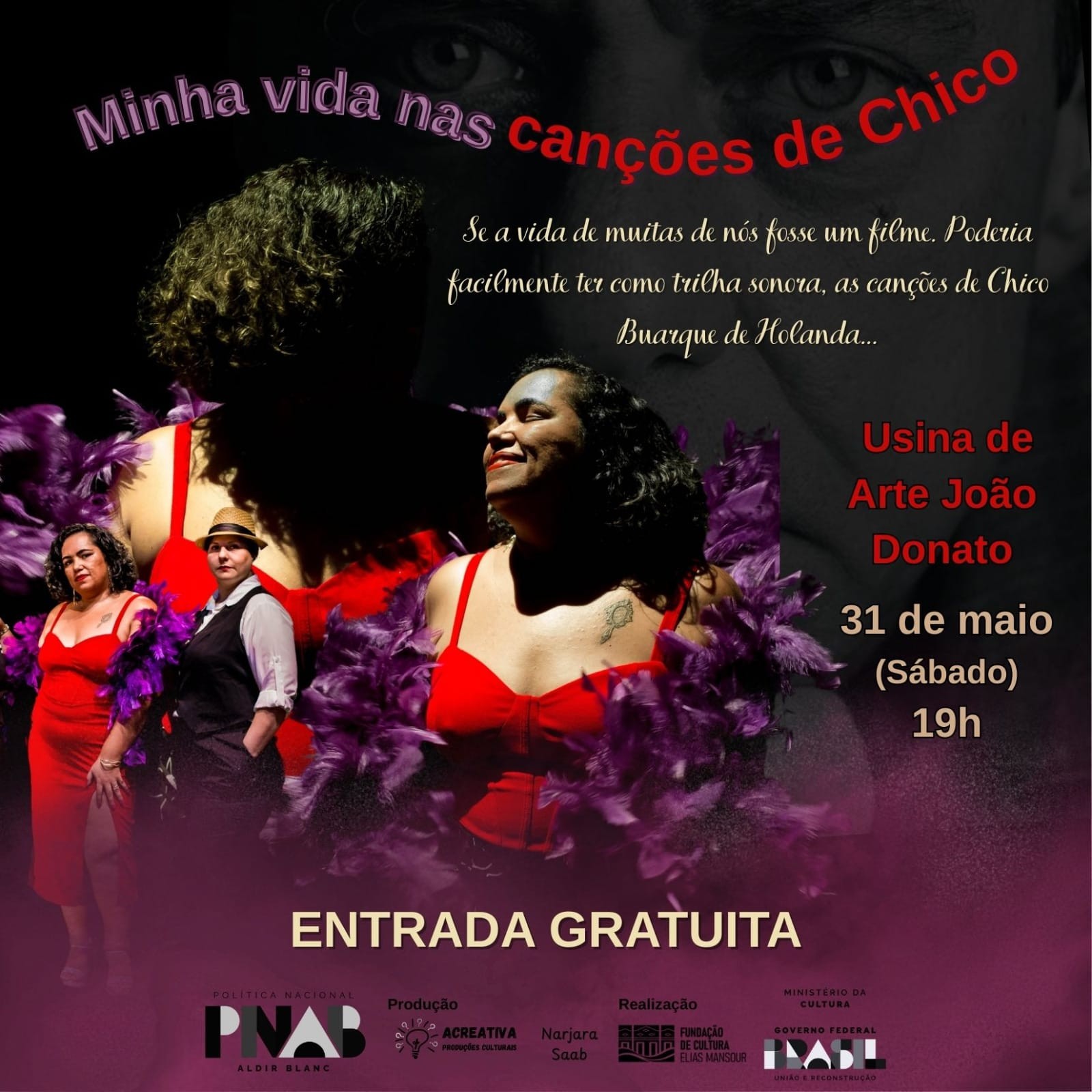 A Usina de Arte João Donato será palco, no próximo 31 de maio (sábado), do espetáculo cênico musical "Minha Vida nas Canções de Chico", uma homenagem sensível e potente ao universo feminino a partir da obra de Chico Buarque. Com entrada gratuita, o espetáculo terá início às 19h, com distribuição de convites a partir das 18h, diretamente na bilheteria do teatro.