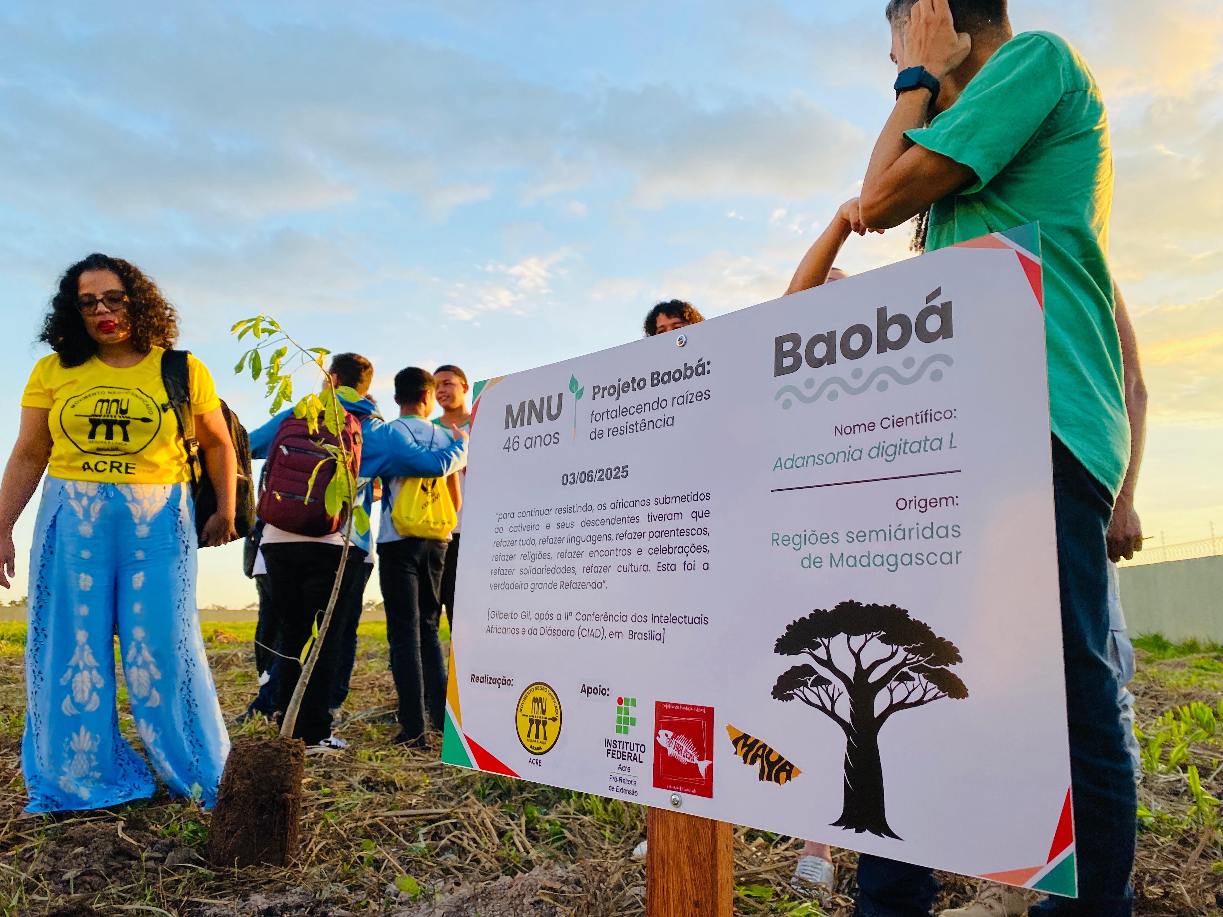 Em comemoração ao Dia da Educação Ambiental, celebrado em 3 de junho, o Instituto Federal do Acre (IFAC) recebeu uma ação simbólica e carregada de significado: o plantio de uma muda de baobá, árvore de origem africana considerada sagrada em diversas culturas. A atividade foi realizada em parceria com o Movimento Negro Unificado (MNU), Produções Maya e o Coletivo Pira-Cena, reunindo estudantes, educadores, artistas e militantes em um gesto de resistência ecológica e celebração da a ncestralidade.